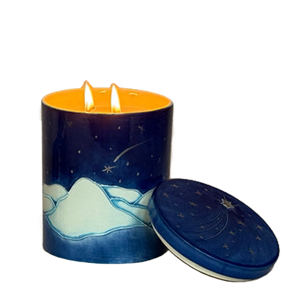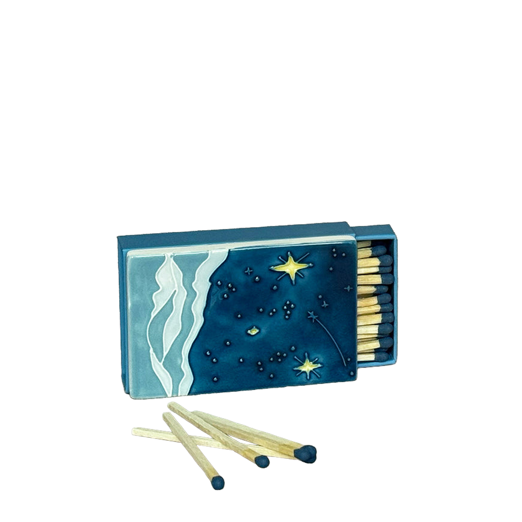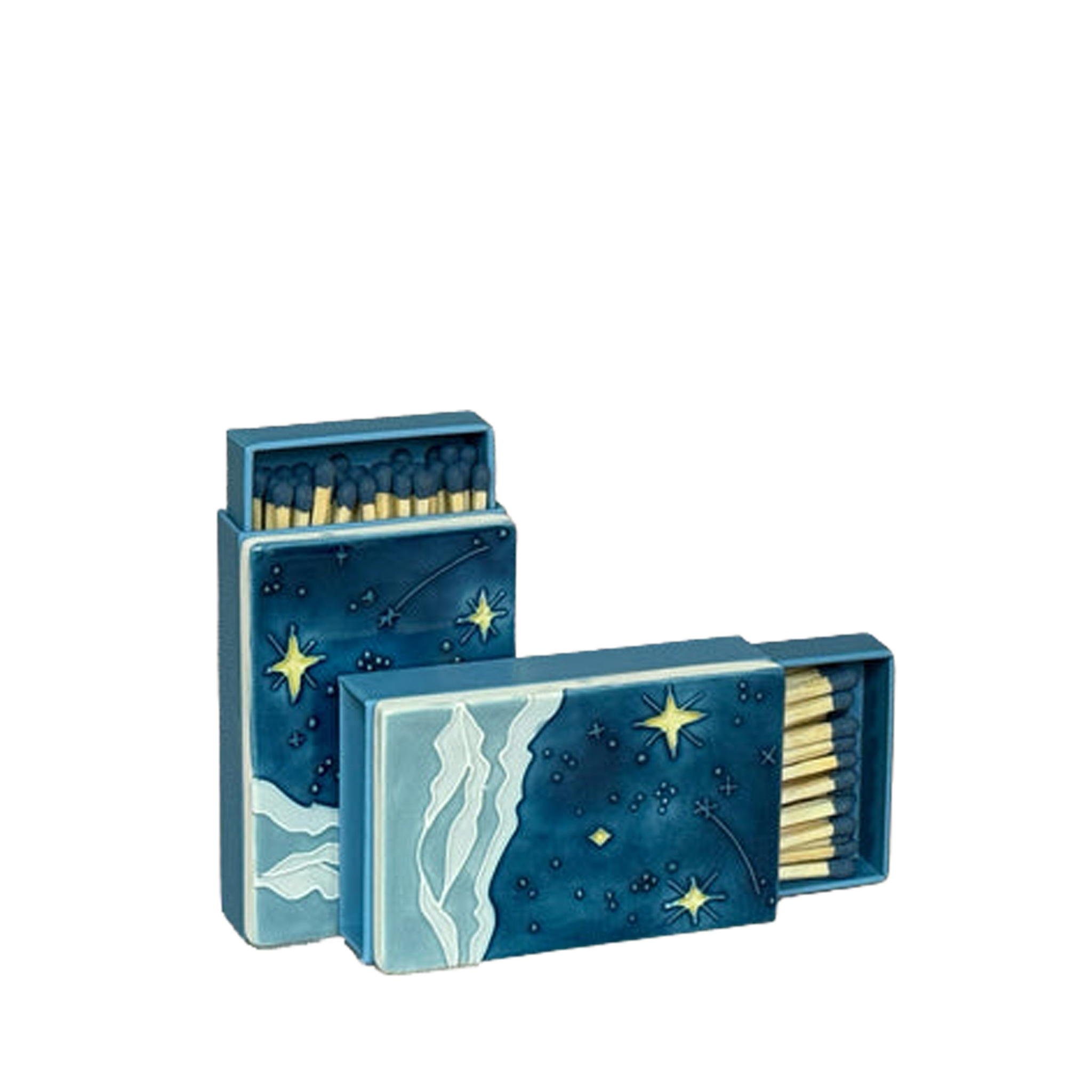 Each piece in the Winter Candle collaboration was imagined as a moment beneath the same sky. The matchbox, brushed with a softer blue and flecks of gold, reflects the tender light that rises before dawn.