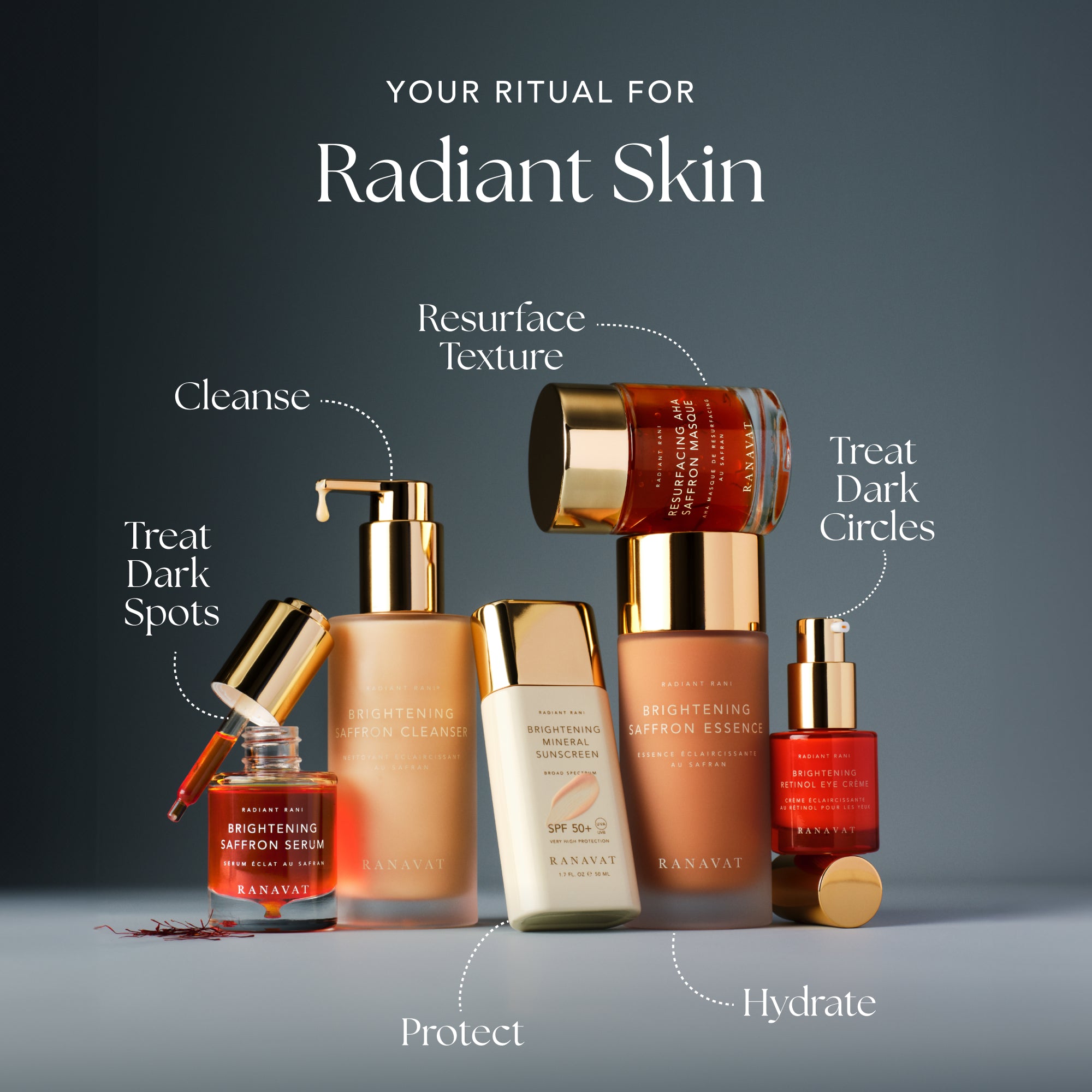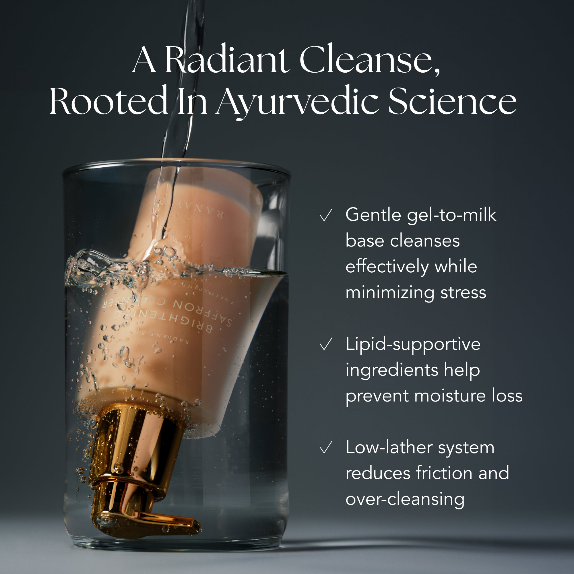 Der Brightening Saffron Cleanser von RANAVAT ist ein antioxidantienreicher Reiniger, der sanft Make-up, Verunreinigungen und überschüssiges Öl entfernt und die Haut sichtbar strahlender und hydratisiert hinterlässt – niemals ausgetrocknet.